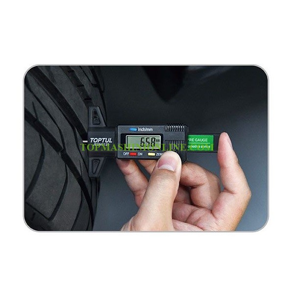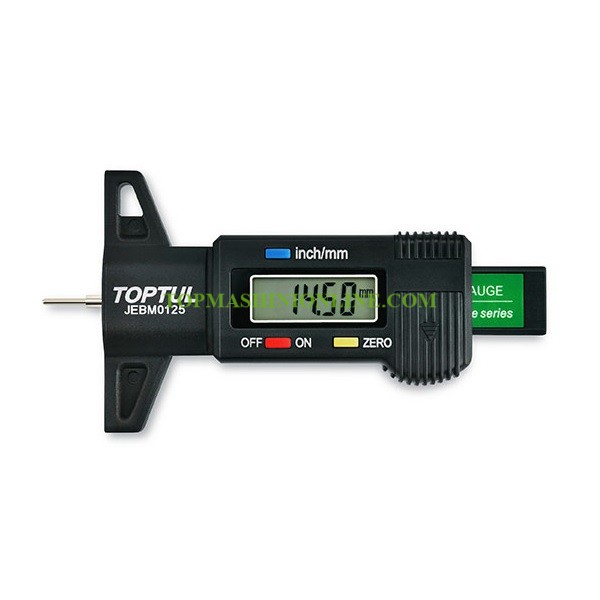 Цифров дълбокомер за измерване дълбочината на протектора на гумите Toptul JDBM0125 е лек и издръжлив с диапазон на измерване 0-25.4 мм. Лесен за четене LCD дисплей (цифрова височина 7,5 мм). Мерна единица в мм или инчове, може да се преобразува по всяко време с един бутон. Автоматично включване и 5 минути автоматично изключване, удължаващи живота на батерията.