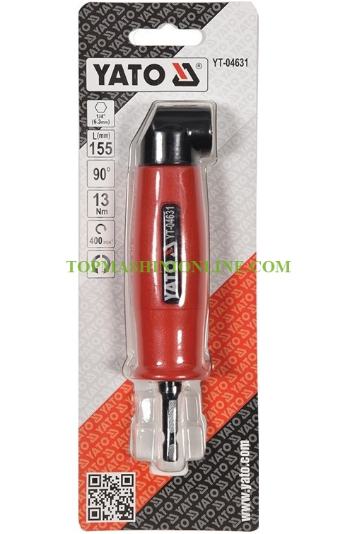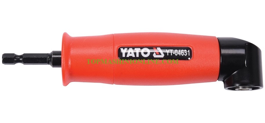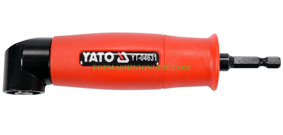 Ъглов адаптер за бормашина Yato YT-04631 със захват 1/4" и предавка на 90° е незаменим при работа на труднодостъпни места. Изработен от въглеродна стомана и корпус покрит с пластмаса.