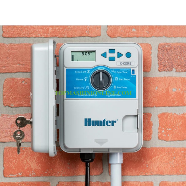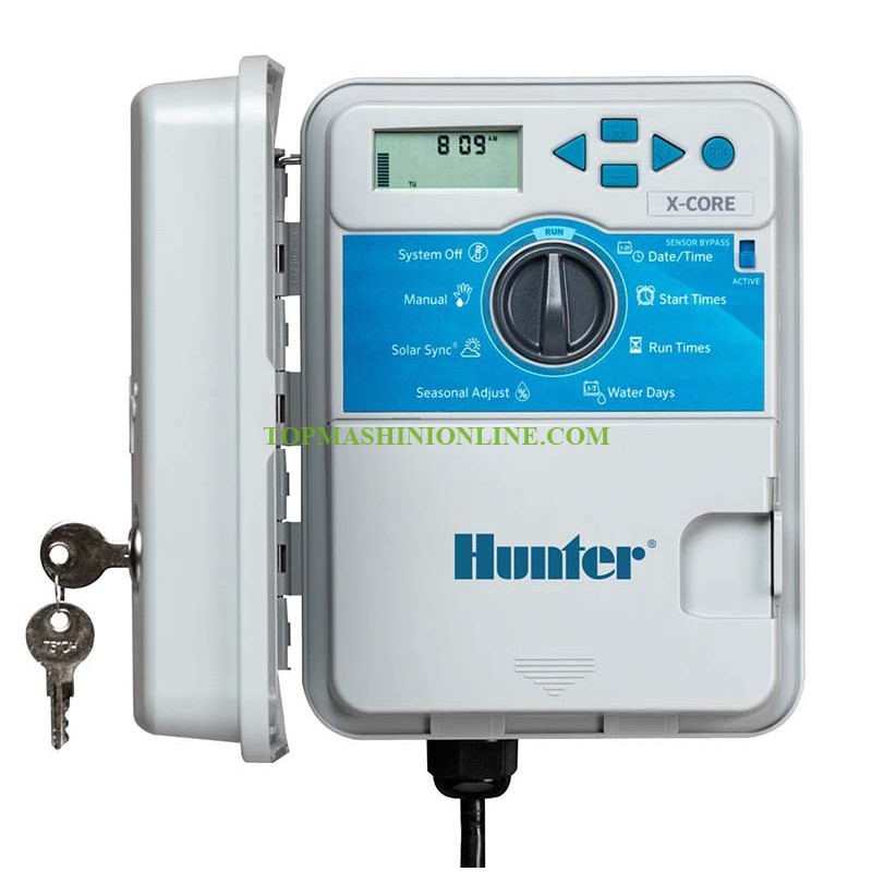 Електронен таймер-програматор за вода Hunter X-CORE XC-601-E е контролно табло за интелигентна напоителна система. Устройството освобождава от ръчен труд и автоматизира напоителната система. Този програматор е за външен монтаж, заводски е произведен с високоустойчива, водонепропусклива кутия. Устройството разполага с трансформатор, който преобразува напрежението от 220 V в 24 V (нужно за електромагнитните клапани). Моделът разполага с шест изхода, за шест клапана (зони или станции). Има 3 програми A,B и C, всяка с по 4 дневни включвания. Времето за работа на всяка станция е от 0 до 4 часа (стъпката е 1 минута). Има 7-дневен календар или реално четно/нечетно програмиране с 365-дневен календарен часовник, или интервално напояване до 31 дни. Устройството разполага с 3 V литиева батерия в комплект, която помага при спиране на тока, за да запазят данните. Solar Sync™ пести вода въз основа на местните метеорологични условия. Вграденото заключване на ключовете на външните модели предпазва от вандализъм. 3 гъвкави програми с 4 начални часа всяка и до 4 часа време на работа. QuickCheck™ осигурява лесна диагностика на дефектно окабеляване. Настройката „Скриване на програми“ показва 1 програма и 1 начален час за опростяване. Спиране на напояването до 99 дни през извън сезона. Защитата от късо съединение открива повреди в окабеляването и пропуска станцията без повреда на системата. Паметта Easy Retrieve™ архивира пълния график за напояване. Забавяне между станциите за бавно затварящи се клапани или презареждане на помпата. Цикълът и накисването предотвратяват разхищението на вода и оттичането в райони с промени в надморската височина или плътни почви. Сезонно регулиране за по-бързи корекции на графика без промяна на времето за работа