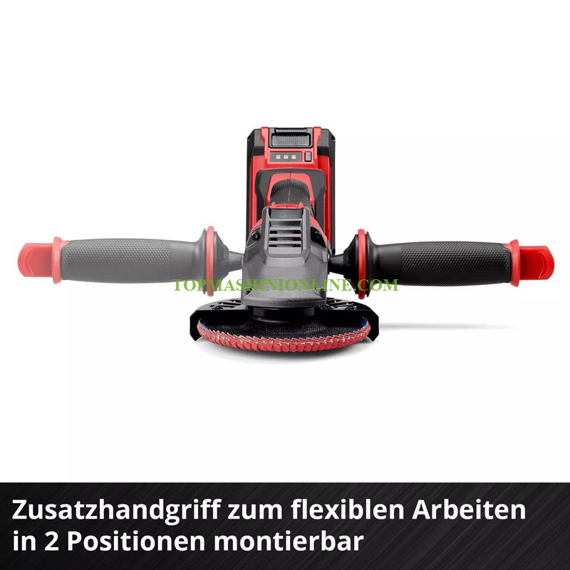Акумулаторен ъглошлайф с диаметър на диска Ø 125 мм Einhell Professional TP-AG 18/125 F Li BL - Solo е мощен помощник за всички ваши нужди в работилницата, дома и гаража. Този ъглошлайф с плоска глава е част от семейството Power X-Change, където всички батерии, зарядни устройства и системни инструменти са съвместими. Оптимални резултати се постигат с батерия 2,5 Ah и батерии с по-голям капацитет от същата серия. Благодарение на мощния си мотор, този безжичен ъглошлайф осигурява същата производителност като сравним модел с кабел от 700 W. Инструментът се захранва от безчетков мотор Einhell за повишена мощност и по-дълго време на работа. Два интегрирани предпазителя за прах предпазват вътрешността на ъглошлайфа от замърсявания и, в комбинация с интелигентен въздушен поток, удължават живота му. Предпазителите могат да се свалят за лесно почистване. Дизайнът с плоска глава на този ъглошлайф го прави идеален за шлайфане в тесни пространства и под ъгли до 43°. Тънкият дизайн с ергономична мека ръкохватка и допълнителната дръжка, която може да се монтира в две позиции, правят работата с този инструмент удобна. Бързорегулируемият предпазител на диска и предпазителят за рязане позволяват гъвкава и безопасна работа. Разделянето на двигателя и скоростната кутия осигурява плавна работа. Плавният старт и защитата от повторно пускане осигуряват повишена безопасност. Защитата от претоварване и здравият алуминиев корпус на скоростната кутия гарантират дълготрайна употреба. Акумулаторният ъглошлайф с плоска глава TP-AG 18/125 F Li BL (продава се самостоятелно) е съвместим с режещи дискове до максимален диаметър 125 мм, което позволява дълбочина на рязане до 33 мм. Включен е извит ламелен диск с керамичен абразив за ефективна обработка на ъглови заварки. Инструментът се доставя без батерия, зарядно устройство или режещ диск.