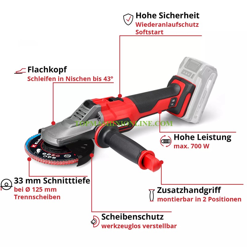 С плоска глава за шлайфане под ъгъл до 43° Плавен старт и защита при рестартиране Прахоустойчива конструкция