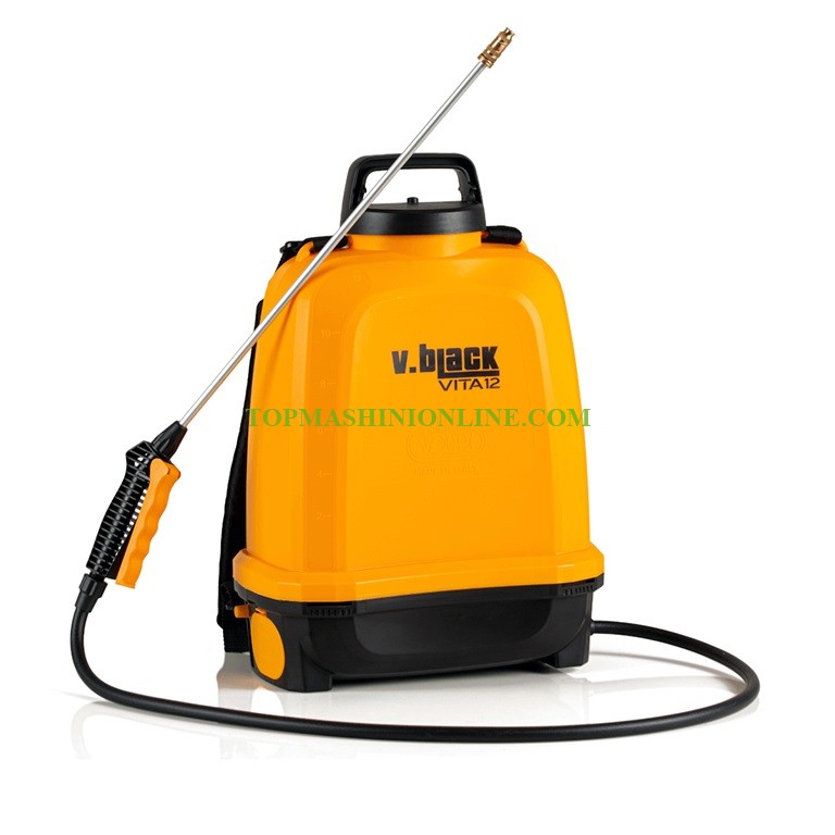 Акумулаторна пръскачка Volpi Originale V.Black Elektron 12 л полипропиленов резервоар и регулируема месингова дюза ф 1.3 мм. Големият диаметър на отвора 105 мм позволява лесно пълнене. Иновативната акумулаторна литиева батерия с напрежение 14.4 V и капацитет 2 Ah, Li-Ion гарантира дълготрайна работа - в режим на пръскане с напълно заредена батерия може да се работи до около 9 часа с налягане 2 бара, oколо 1 час с налягане 5 бара, а при пръскане с хербициди, с налягане 0.5 bar - до 15 часа. Оборудвана е с практичен електронен регулатор за налягане, волтметър и възможност за добавяне на манометър. Работното й налягане е 0.5-5 bar, уплътнението - NBR, а дължината на маркуча - 1.5 м. Обхват на пръскане около 3,6 метра. Доставя се с удобни регулируеми ремъци за носене на гръб.