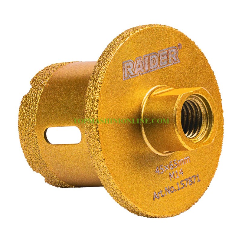 Диамантена боркорона за ъглошлайф Raider 157871 е предназначена за професионално пробиване и оформяне на отвори при монтаж на мивки и санитарни елементи. Тя комбинира висока скорост на работа с прецизен контрол, като позволява получаване на чист и равен отвор дори в най-твърдите материали. Позволява пробиване на отвор Ø45 мм и оформяне до Ø65 мм чрез шлайфане. Съвместима с всички стандартни ъглошлайфи (M14 резба). Подходяща е за работа върху гранит, мрамор, керамика, порцелан, камък и тухли.