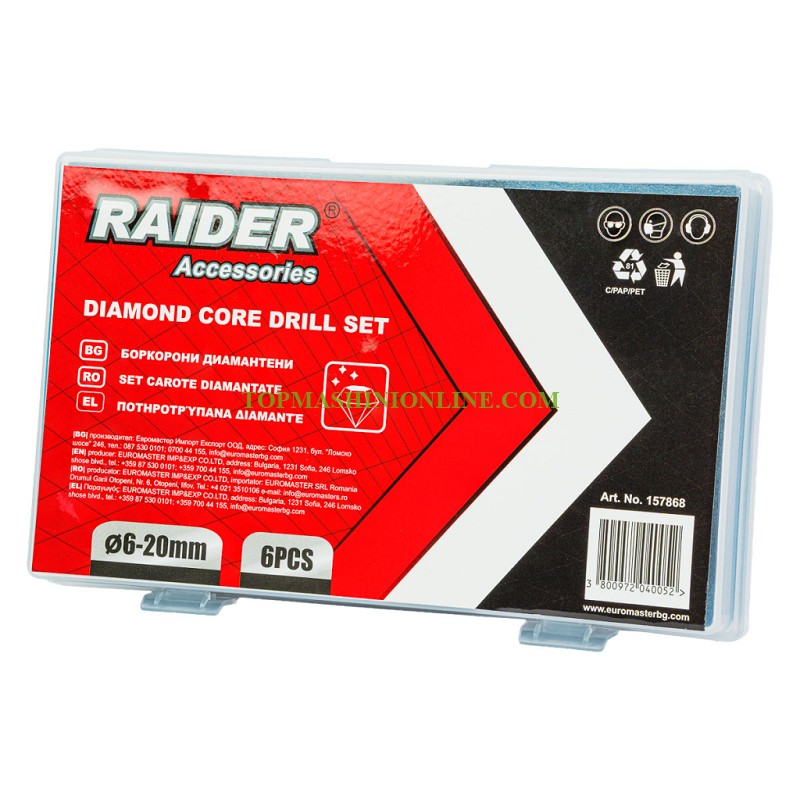 Комплектът боркорони и диск за ъглошлайф Raider 157868 включва 6 броя висококачествени диамантени боркорони, с диаметър от 6 до 20 мм, са създадени за прецизно сухо пробиване в твърди и крехки материали като керамика, гранитогрес, фаянс и стъкло. Благодарение на диамантеното покритие, инструментите осигуряват висока ефективност, точност и устойчивост на износване. Компактният набор е особено подходящ за монтажни и довършителни дейности, където се изисква работа с по-малки диаметри. Необходимостта от използване на вода за охлаждане е елиминирана, което улеснява работата и спестява време. Всички боркорони са подредени в удобен и здрав органайзер, който гарантира добра защита, лесен достъп и отлична организация.