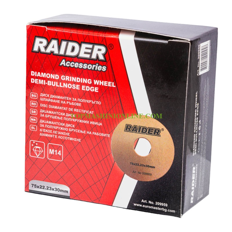 Диамантеният диск за шлайфане с дебелина 30 мм Raider 209959 с диаметър 75 мм е предназначен за по-интензивно шлифоване и оформяне на ръбове. Полукръглият (деми-бълноуз) профил осигурява равномерно обработване и гладък преход при оформяне на ръбове. Висококачествените диамантени сегменти гарантират устойчивост на износване и дълъг експлоатационен живот. Идеален е за работа с камък, бетон, керамика и други твърди материали. Съвместим е с ъглошлайфи и ротационни инструменти за професионални и домашни приложения.