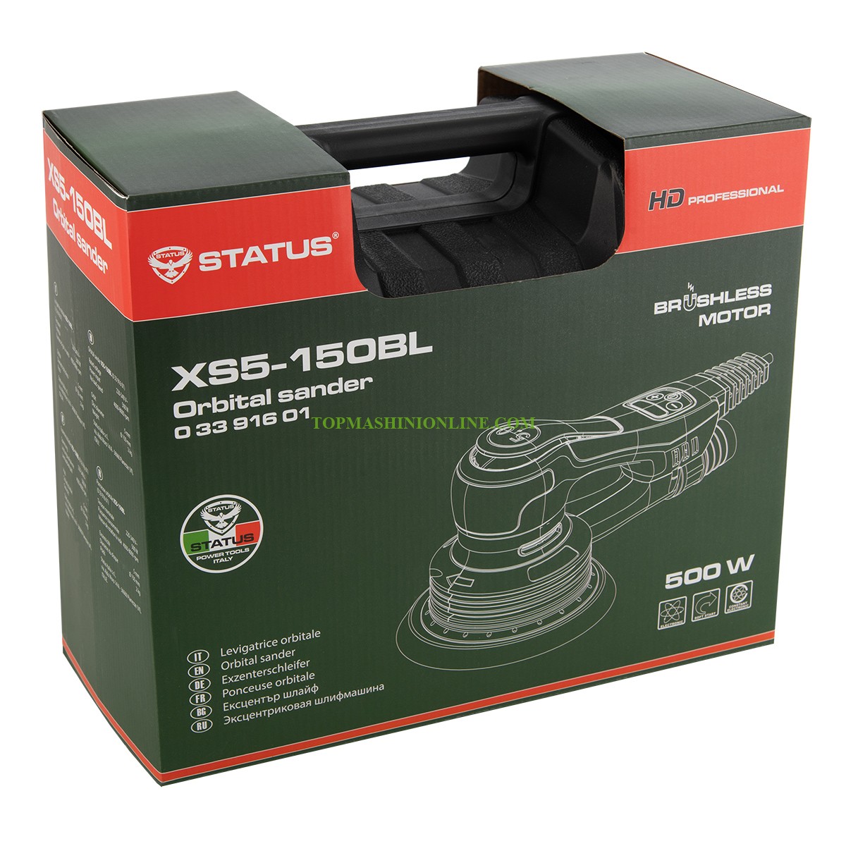 Ексцентършлайф Status XS5-150BL 500 W с безчетков мотор и LCD дисплей показващ скоростта на въртене е подходяща машина за шлайфане на разнородни повърхности като може да се използва още за обработка на вдлъбнати, заоблени или плоски повърхности. Велкро подложка за закрепване на шкурките. Ергономична ръкохватка с гумирано покритие. Текстилен контейнер за прах. Система за прахоотвеждане с възможност за свързване към прахосмукачка.