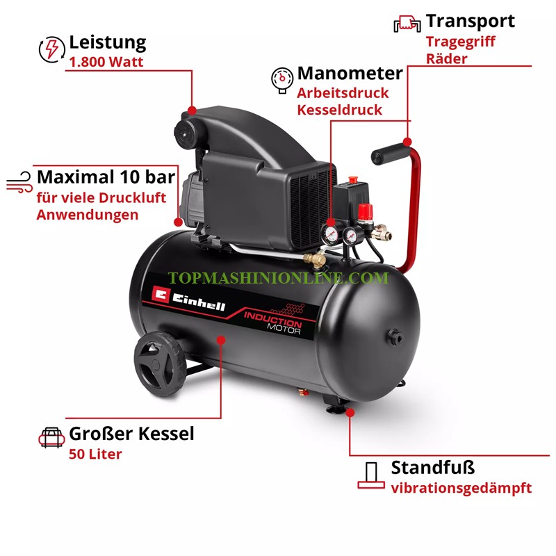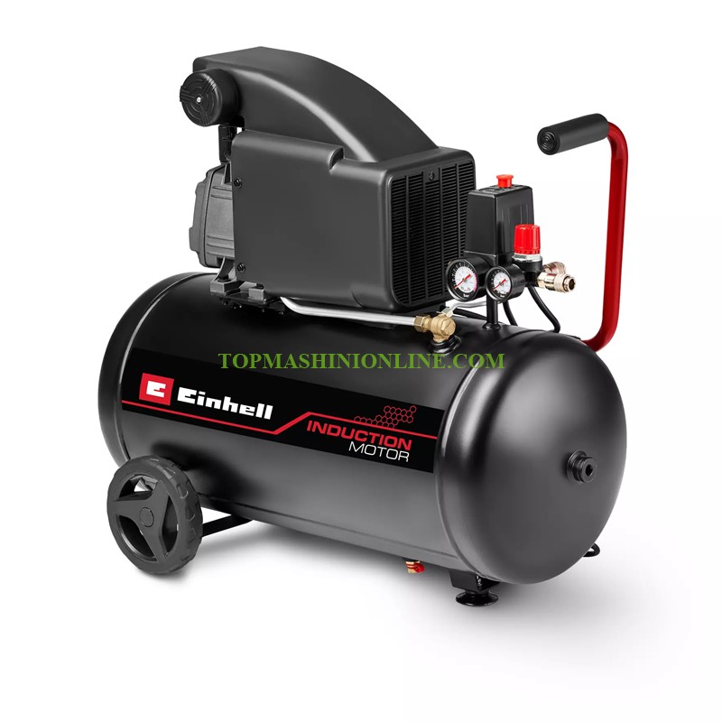 Монофазен компресор Einhell TC-AC 270/50/10 е практичен помощник в работилницата и гаража. Независимо дали нанасяте бои и лакове, работите с инструменти или просто напомпвате гуми: благодарение на мощния си 1800-ватов индукционен двигател и всмукателен капацитет от 270 л/мин, компресорът е оборудван за всяка задача. Максималното работно налягане от 10 бара може да се регулира ръчно с помощта на регулатора на налягането. Предвиден е манометър както за нерегулираното налягане в резервоара, така и за регулираното работно налягане. Големият 50-литров резервоар предлага достатъчни резерви от въздух за множество приложения със сгъстен въздух. Дръжка за носене и две здрави колела позволяват бързо и лесно транспортиране на масления компресор до желаното работно място. Кондензираната вода може лесно да се източи през дренажна пробка.