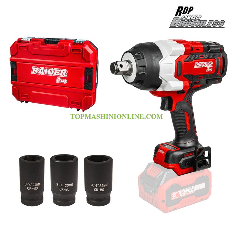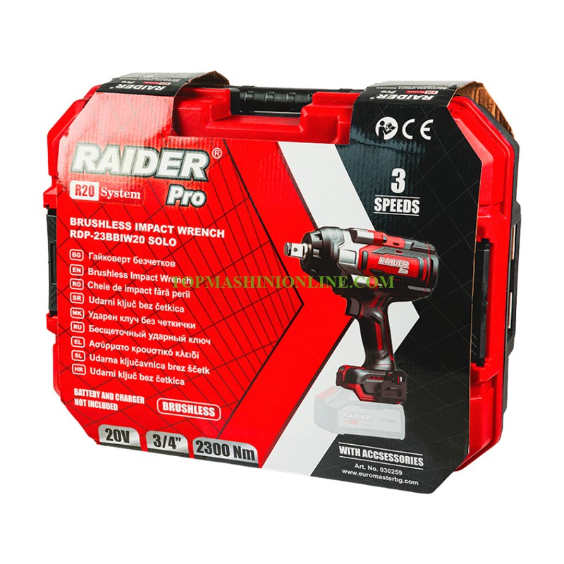 Трискорстен безчетков ударен акумулаторен гайковерт Raider pro RDP-23BBIW20 Solo 3/4", 20 V, Li-ion, 2300 Nm, R20 System, без батерия и зарядно устройство, 030259 с 3 вложки в куфар