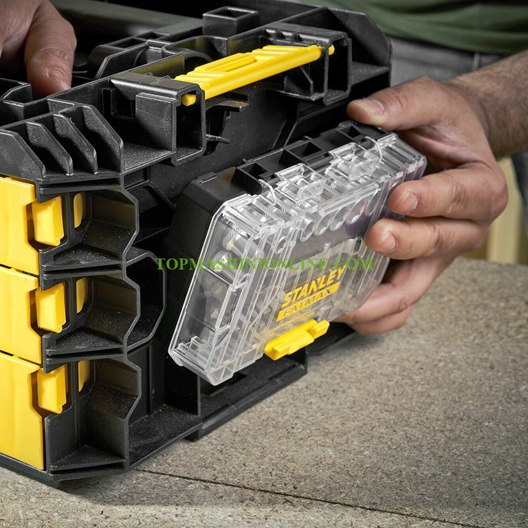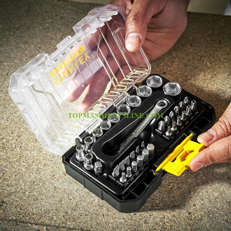 Комплект гедоре 37 части Stanley Fatmax FMMT19101-0 включва биметалната 1/4" тресчотка с 60 фини зъба, която се затяга през стъпка 6°, което осигурява добър капацитет на затягане с точност при работа в тесни пространства. Вложките с размери 5, 5,5, 6, 7, 8, 9, 10, 11, 12, 13 и 14 мм имат Maxdrive профил за максимален контакт между вложката и гайката, конструкция с наклонена глава за улесняване на използването в ограничени среди, назъбване за по-лесно изваждане и използване, и видими размери за лесно определяне на размера на вложката. В комплекта са включени още държач за вложки и 30 бита 1/4" с дължина 25 мм - прави 3, 4, 5, 6, 7 и 8 мм, PZ1, PZ2 и PZ3, PH1, PH2 и P3, шестостенни 3, 4, 5, 5,5, 6 и 7 мм и Torx с отвор TT10, TT15, TT20, TT25, TT27 и TT30. Доставя се в здрава пластмасова кутия с прозрачен капак, напълно съвместима с модулната система Stanley Fatmax ProStack.