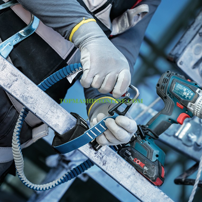 Предпазен ремък Bosch Pro Heavy 2607990163 е с ударопоглъщаща конструкция, омекотява ударите и забавя и спира изпуснат инструмент. Изработен е от много здрава найлонова тъкан с плътност 1680D за изключителна устойчивост на разкъсване и опън. В отпуснато състояние ремъкът е с дължина 1100 мм, а в максимално опънато - 2000 мм. Заключващият се с въртене на ключалката карабинер може безопасно да се отключва и заключва с една ръка, а дългата въжена примка позволява лесно закрепване на инструмента. Издържа на товари до 16 kg и е съвместим със стандарта ANSI 121-2023.