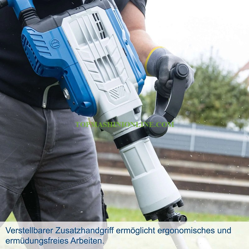 С електрически къртач Scheppach AB1950 с мощност 1900 W, честота на ударите 2000 мин-¹ и енергия на удара 60 J, разрушаването на стени, премахването на подови плочки или разбиването на основи, камъни и бетонни блокове е детска игра за всеки майстор, независимо дали е у дома или на строителна площадка. Благодарение на компактния и тънък дизайн, работата на труднодостъпни места е възможна. Вместо ръчна работа с чук и длето, длетото на чука за разрушаване пробива в материала, който трябва да се отстрани, и го раздробява. Това значително намалява физическите усилия, необходими за разрушаване, правейки работата по-бърза и по-ефективна. Високото тегло на машината подпомага този процес, тъй като позволява генерирането на по-голямо налягане. С тегло от 16,5 кг. къртачът практически се забива в земята сам. Смяната на инструментите е бърза и лесна, без да се изискват допълнителни инструменти, благодарение на бързоосвобождаваща се скоба. Двете дръжки с меко захващане осигуряват сигурно захващане на къртача, дори при продължителна употреба. Предната дръжка може да се регулира според индивидуалните нужди с помощта на заключващ винт. Задната D-образна дръжка не само насърчава ергономичната позиция на ръката, но и улеснява изваждането на къртача от развалините на земята. Оборудван е с 30 мм шестоъгълен държач за инструменти. Доставя се с плоско и остро длето в пластмасов куфар с колелца за транспортиране и правилно съхранение.
