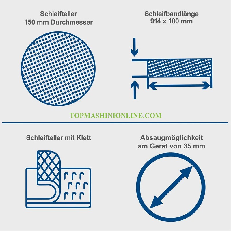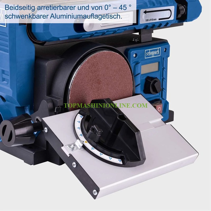 Стационарен лентов и дисков шлайф Scheppach BTS800Vario с мощност 400 W, диск за шлифоване с диаметър 150 мм на лента с размер 915х100 мм е комбиниран лентов и дисков шлайф, предназначен за прецизна обработка на дърво, пластмаса и метал. Машината е оборудвана с мощен и надежден индукционен електромотор 400 W и променлива скорост на въртене. Шлифовъчната лента с размер 915 × 100 мм и дисковият шлайф Ø150 мм позволяват гъвкава работа при оформяне, заглаждане и фино шлифоване. Алуминиевата работна маса и стабилният корпус от алуминиев лят под налягане осигуряват висока устойчивост и дълъг експлоатационен живот.