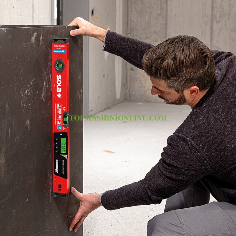 Дигитален алуминиев нивелир тип кутия с дължина 600 мм, точност 0.5 мм/м Sola REDM 60 Digital с изключително мощни неодимови магнити, и е идеален за употреба навсякъде, където е необходимо бързо и прецизно измерване на наклони и ъгли. Има 2 патентовани либели Sola Focus - хоризонтална и вертикална, вграден електронен модул за измерване на наклони и Bluetooth интерфейс. Толерансът на измерване на модула Solatronic е 0,05° при 0° и 90°, и 0,10° между 1° и 89°. Странично монтиран магнит осигурява непрекъсната измервателна повърхност и максимална защита от магнити. Цифровият дисплей с постоянна подсветка се завърта автоматично в обърнати позиции и може да изобразява измерените стойности на наклона в °, мм/м, % и инч/фут. Функцията HOLD осигурява съхраняване на резултатите от измерванията и прехвърляне на ъгли. Bluetooth интерфейсът в комбинация с приложението Sola Measures позволява прехвърляне на данни от измерванията в реално време към смартфона, дистанционно управление на функциите за измерване, управление, документиране и изпращане на стойности от измерванията. Степента на защита IP65 прави нивелира прахоустойчив и защитен от водни струи.