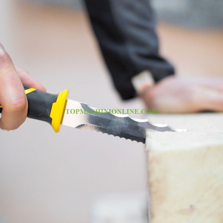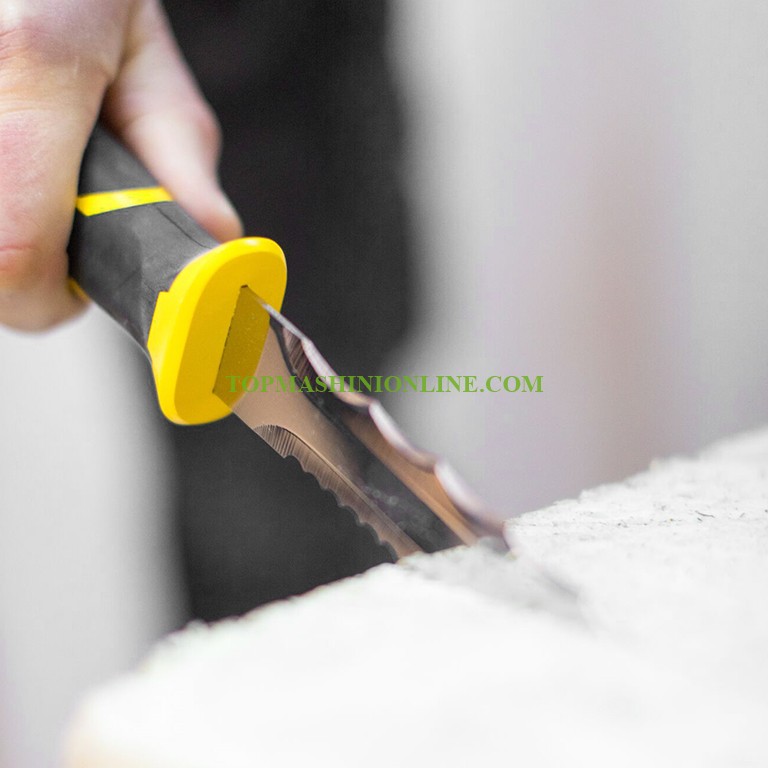 Нож за рязане на минерална и каменна вата, стиропор и др. Stanley Fatmax FMHT10327-1 е специализиран нож от неръждаема стомана с двукомпонентна ръкохватка и двустранно назъбване. Вълнообразните зъби са подходящи за рязане на меки материали като стъклена вата, пенообразни материали и др., а фините зъби са предназначени за твърди материали с висока плътност като стиропор, изолационни блокчета и др. Общата дължина на ножа е 350 мм, на острието - 275 мм, а дебелината му - 2 мм. Доставя се с калъф.