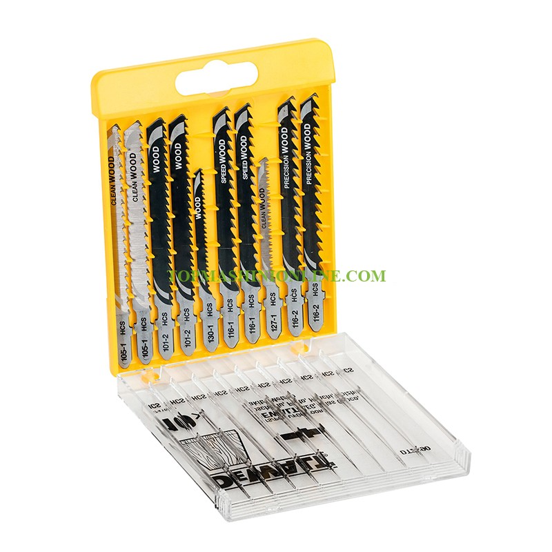 10 броя ножа за зеге с Т-образен захват DeWALT DT2290-QZ са предназначени за рязане на дърво, дърво с пластмасово покритие, ПДЧ и пластмаса. Разполагат с прецизно шлифовани зъби за равни и чисти разрези, а здравата и издръжлива конструкция гарантира дълъг живот на острието. Висококачествената HCS стомана, от която са изработени ножовете осигурява голяма устойчивост на износване и надеждност при интензивна употреба. В комплекта са включени по 2 ножчета T101B с дължина 73 мм, T111C с дължина 75 мм, T144D с дължина 68 мм и T144DP с дължина 68 мм, и по 1 ножче T1190BO с дължина 48 мм и T101AO с дължина 47 мм.