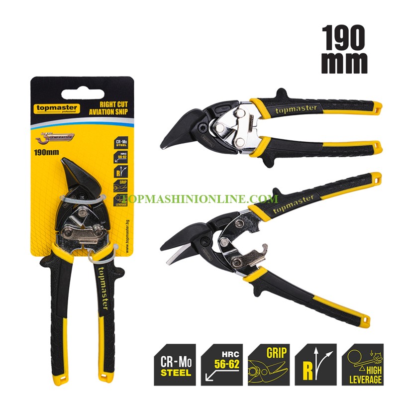 Ножица за рязане на ламарина дясна с дължина 190 мм Top Master Pro 370722 е предназначена за прецизно и ефективно рязане при интензивна употреба. С дължина 190 мм, тя е специално проектирана за криволинейни разрези вляво, изрязване на контури, отвори и различни форми, като осигурява отлична видимост на линията на рязане и стабилен контрол. Инструментът е изработен от висококачествена хром-молибденова стомана, гарантираща висока здравина и дълъг експлоатационен живот. Остриетата са закалени до 56–62 HRC, което осигурява отлична износоустойчивост и дълготрайна острота дори при продължителна и натоварена работа.