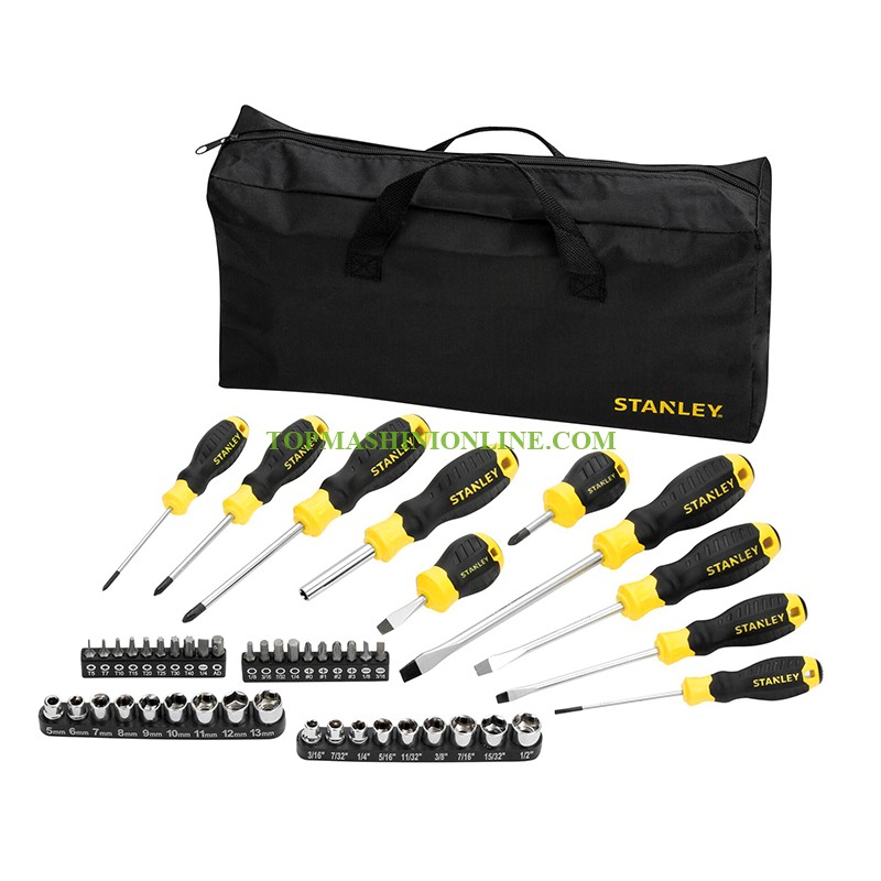 Комплект отвертки Stanley STHT0-70887 включва 10 отвертки изработени от хром-ванадиева стомана и гумирана ръкохватка, 9 милиметрови и 9 инчови вложки със захват 1/4" и 20 бита, всичко в удобна и здрава текстилна чанта. Отвертките са прави 3х75, 5х100, 6x38, 6х100 и 8х150 мм, и кръстати PH 0x75, PH 2x38 и PH 2x100. Милиметровите вложки са с размери 5, 6, 7, 8, 9, 10, 11, 12 и 13 мм, а инчовите - 3/16", 7/32", 1/4", 5/16", 3/8", 7/16", 15/32" и 1/2". Битовете са с дължина 25 мм и шестостенен захват - SB4, 5 и 6, PH0, 1, 2 и 3, Hex 4, 5, 5.5 и 6 мм и Torx T5, T10, T15, T20, T25, T30 и T40.