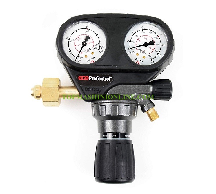 Редуцир вентил за диазотен оксид (райски газ) GCE ProControl до 10 bar и присъединителна резба 3/8". Манометри с 3 индикатора и контрастен показалец в съответствие с ISO 5171. Конструкцията му е напълно безопасна и съответства на стандарт ISO 2503. Здрава гумена капачка предпазва от повреди и нечистотии, а за прецизност и стабилност на параметрите регулирането става с капсулован клапан.