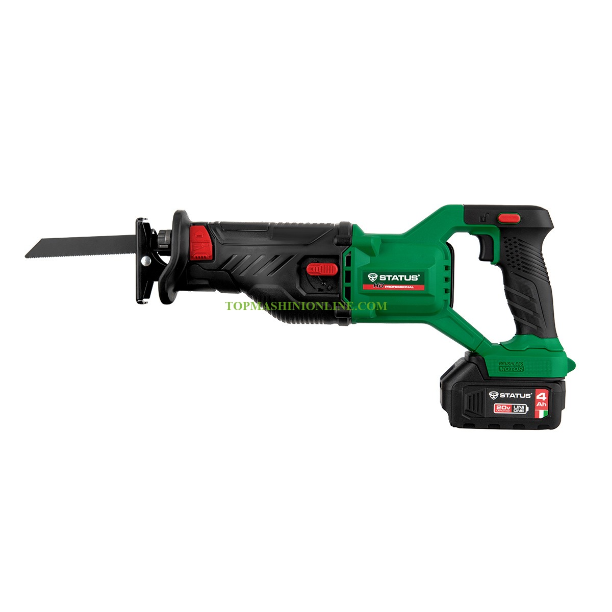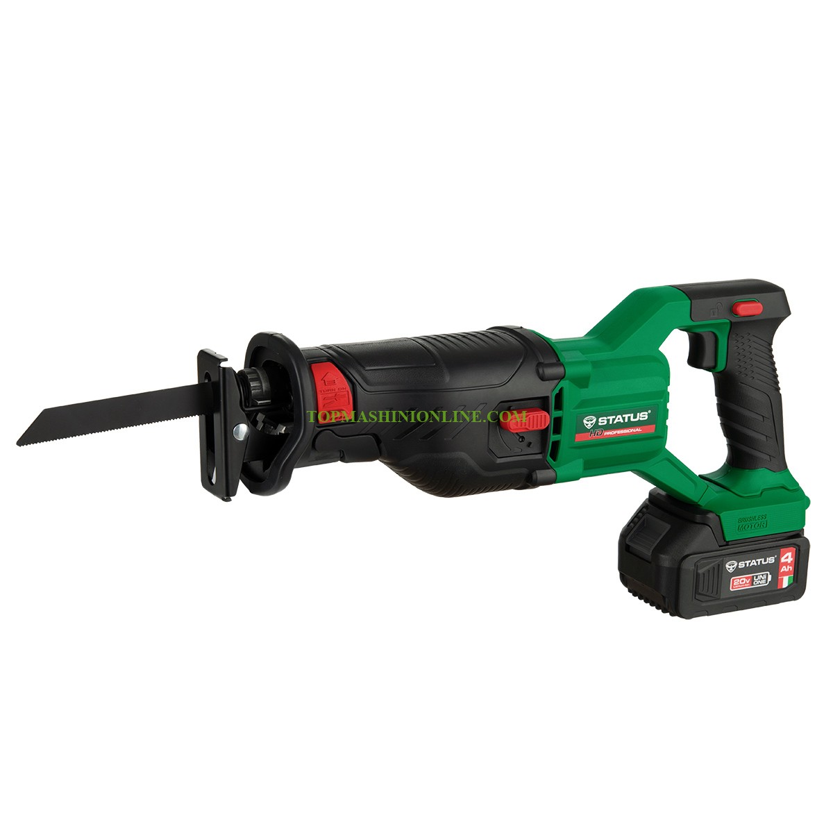 Акумулаторен саблен трион с безчетков мотор Status RS800BL 20 V, 4.0 Ah, Li-ion е с вградено осветление на зоната за рязане. Система за бърза смяна на ножовете, гумирана предна и задна дръжка. Регулиране на честотата на двойните ходове чрез степента на натиск върху превключвателя.