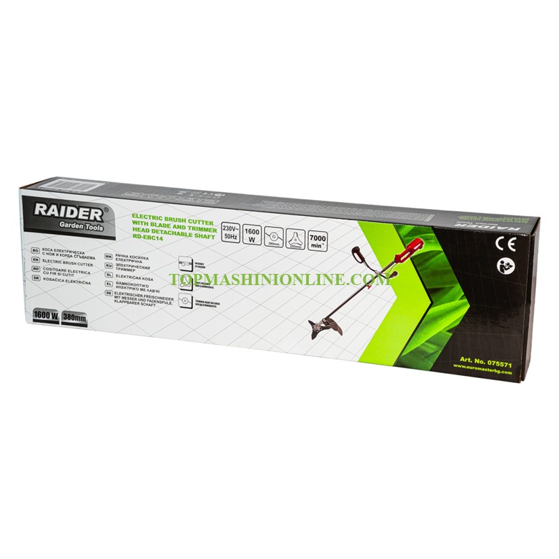 Разглобяема електрическа коса за трева с нож и корда Raider RD-EBC14 е с мощност 1600 W, ширина на косене с метален нож от 255 мм и ширина на косене с корда от 380 мм е предназначен за косене на трева, плевели и по-гъста растителност в дворове, градини и тревни площи.  Косата позволява работа както с режещ нож, така и с корда, което я прави универсално решение за различни видове терени и растителност. При използване на нож двигателят достига максимални обороти до 7500 мин-¹, а при работа с корда – до 7000 мин-¹, осигурявайки ефективно и равномерно косене. Широчината на косене от 380 мм позволява бързо покриване на по-големи площи. Моделът разполага със сгъваема конструкция, която улеснява транспортирането и съхранението. За по-комфортна работа нивото на вибрационните ускорения е под 2.5 m/s², което намалява умората при продължителна употреба. Косата е проектирана с внимание към безопасността и надеждността – ниво на звуково налягане 82 dB, ниво на звукова мощност 96 dB, клас на защита на електроизолацията II и степен на защита IPX4, осигуряваща защита срещу водни пръски. Това я прави подходящ инструмент както за домашна употреба, така и за поддръжка на дворове и градини.