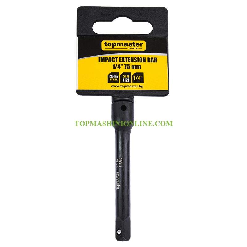 Удължение ударно 1/4" Top Master Pro 330752 с дължина 75 мм е изработено от Cr-Mo стомана и е закалено по DIN 3121 за изключителна здравина и устойчивост. Осигурява стабилно предаване на въртящ момент при ударен режим на работа. Съвместимо е с всички стандартни 1/4" вложки. Може да се използва с ударни винтоверти и гайковерти.