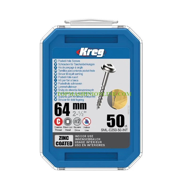 Самонарезни винтове за дърво със самонарезна глава с дължина 64 мм Kreg SML-C250-50 50 броя са съвместими са с всички шаблони за пробиване Kreg Pocket-Hole Jigs®. Имат голяма глава с фланец за сигурно задържане. Подходящи са за използване на закрито в мека дървесина, OSB, ПДЧ и MDF.