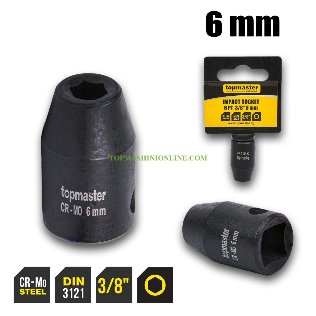 Шестостенна ударна вложка 3/8", 6 мм Top Master Pro 330801 e изработена от хром-молибденова стомана (Cr-Mo), закалена по DIN 3121, тя осигурява висока здравина и устойчивост на деформации. 6-стенен профил за сигурен захват на малки крепежни елементи. Предназначена за прецизни монтажни и демонтажни дейности