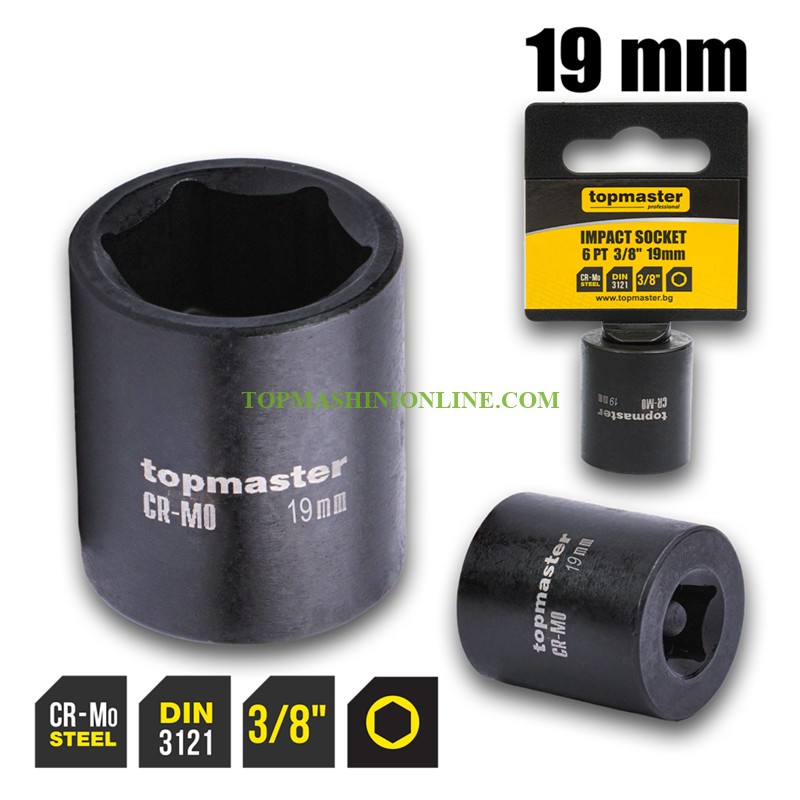 Шестостенна ударна вложка 3/8", 19 мм Top Master Pro 330814 e произведена от Cr-Mo хром-молибденова стомана и термично закалена по стандарт 3121, тя предлага изключителна устойчивост при ударно натоварване и продължителна експлоатация. Шестостенният профил осигурява сигурно прилягане и ефективно предаване на въртящия момент. Широко използвана при автомобилни ремонти, монтаж на конструкции и индустриална поддръжка. Съвместима с всички ударни гайковерти и ръчни инструменти с квадрат 3/8".