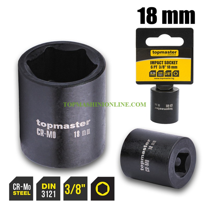 Шестостенна ударна вложка 3/8", 18 мм Top Master Pro 330813 e произведена от Cr-Mo хром-молибденова стомана и термично закалена по стандарт 3121, тя предлага изключителна устойчивост при ударно натоварване и продължителна експлоатация. Шестостенната конструкция осигурява стабилен захват и предпазва крепежните елементи от повреждане. Подходяща е за работа в автомобилни сервизи, промишлени монтажи и ремонтни дейности. Може да се използва с ударни гайковерти – пневматични, електрически и акумулаторни, както и с тресчотки и удължители 3/8".
