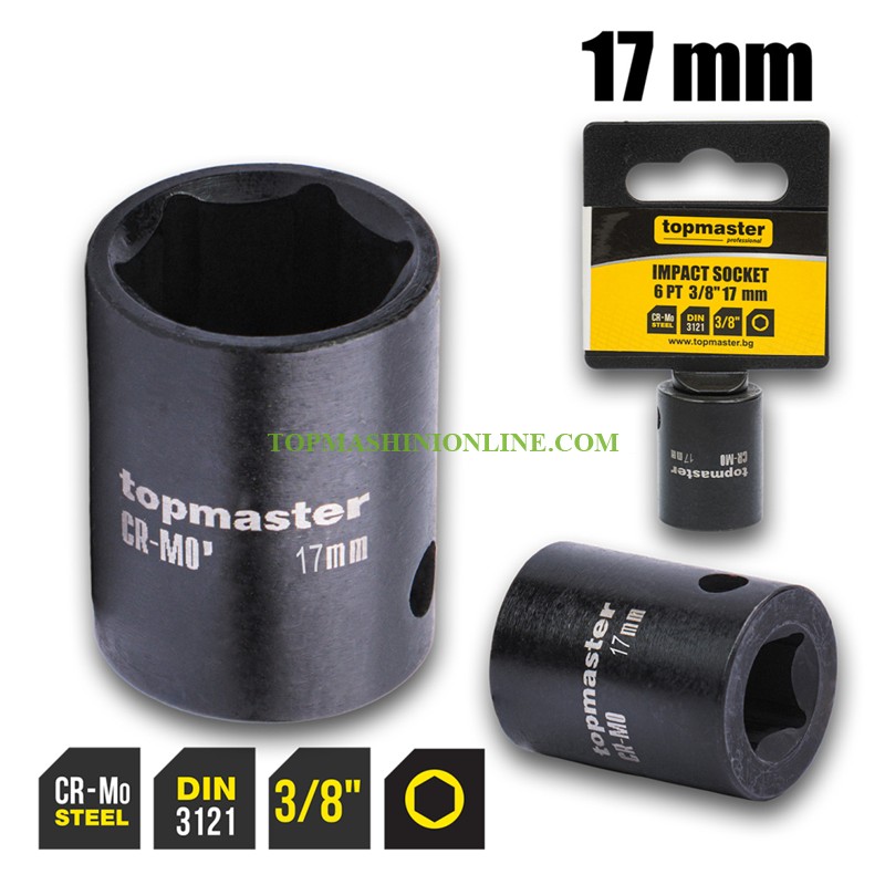 Шестостенна ударна вложка 3/8", 17 мм Top Master Pro 330812 e произведена от Cr-Mo хром-молибденова стомана и термично закалена по стандарт 3121, тя предлага изключителна устойчивост при ударно натоварване и продължителна експлоатация. Шестостенният профил гарантира сигурно прилягане и ефективно предаване на въртящия момент. Размер 17 мм е стандартен при автомобилни ремонти, поддръжка на машини и индустриални приложения.Съвместима е с ударни гайковерти (пневматични, електрически и акумулаторни), както и с ръчни инструменти с квадрат 3/8".