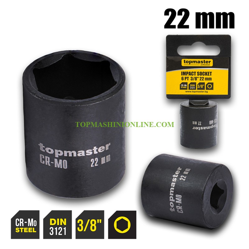 Шестостенна ударна вложка 3/8", 22 мм Top Master Pro 330817 e произведена от Cr-Mo хром-молибденова стомана и термично закалена по стандарт DIN 3121, тя предлага изключителна устойчивост при ударно натоварване и продължителна експлоатация. Шестостенният профил гарантира сигурно захващане и ефективно предаване на въртящия момент. Подходяща за индустриални приложения, автомобилни ремонти и професионални сервизи. Съвместима и с всички ударни гайковерти и ръчни инструменти с квадрат 3/8".