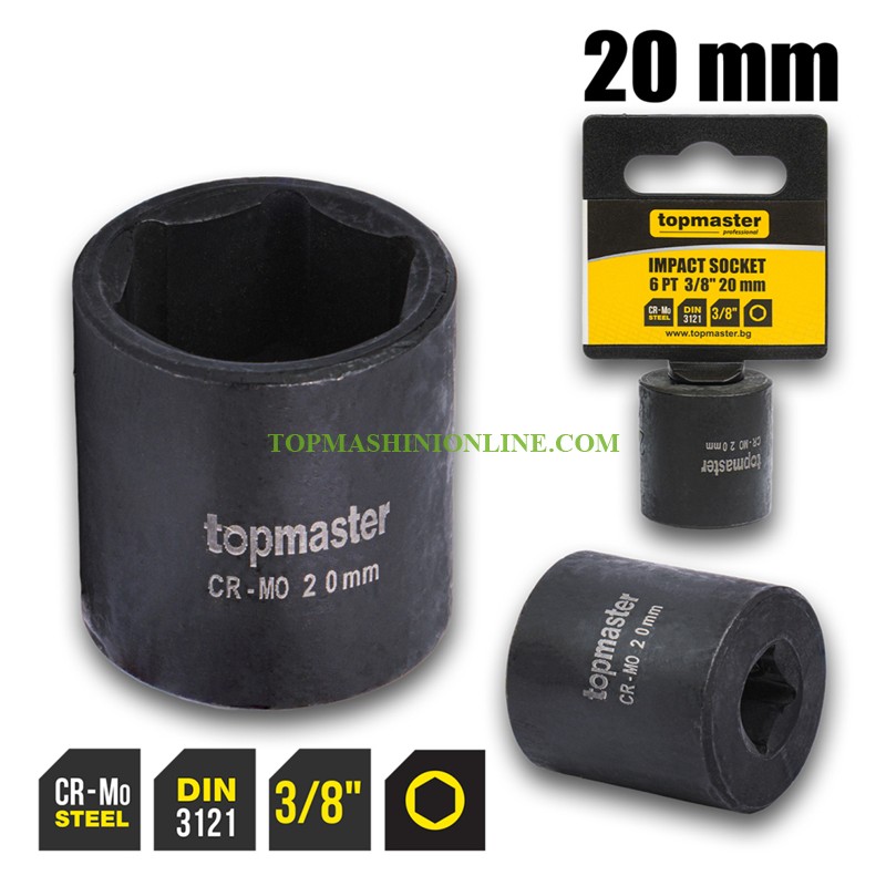 Шестостенна ударна вложка 3/8", 20 мм Top Master Pro 330815 e произведена от Cr-Mo хром-молибденова стомана и термично закалена по стандарт DIN 3121, тя предлага изключителна устойчивост при ударно натоварване и продължителна експлоатация. Шестостенният дизайн осигурява стабилен захват и намалява риска от повреда на крепежа. Подходяща за автомобилни сервизи, машиностроене и индустриални приложения.