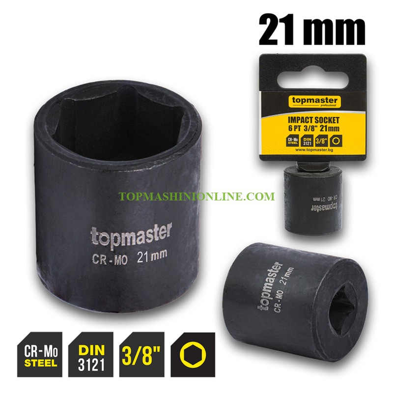 Шестостенна ударна вложка 3/8", 21 мм Top Master Pro 330816 e произведена от Cr-Mo хром-молибденова стомана и термично закалена по стандарт DIN 3121, тя предлага изключителна устойчивост при ударно натоварване и продължителна експлоатация. Шестостенният профил гарантира сигурно захващане и равномерно разпределение на силата.Подходяща за професионална употреба в сервизи и индустрията. Съвместима е с ударни гайковерти и ръчни инструменти с квадрат 3/8".