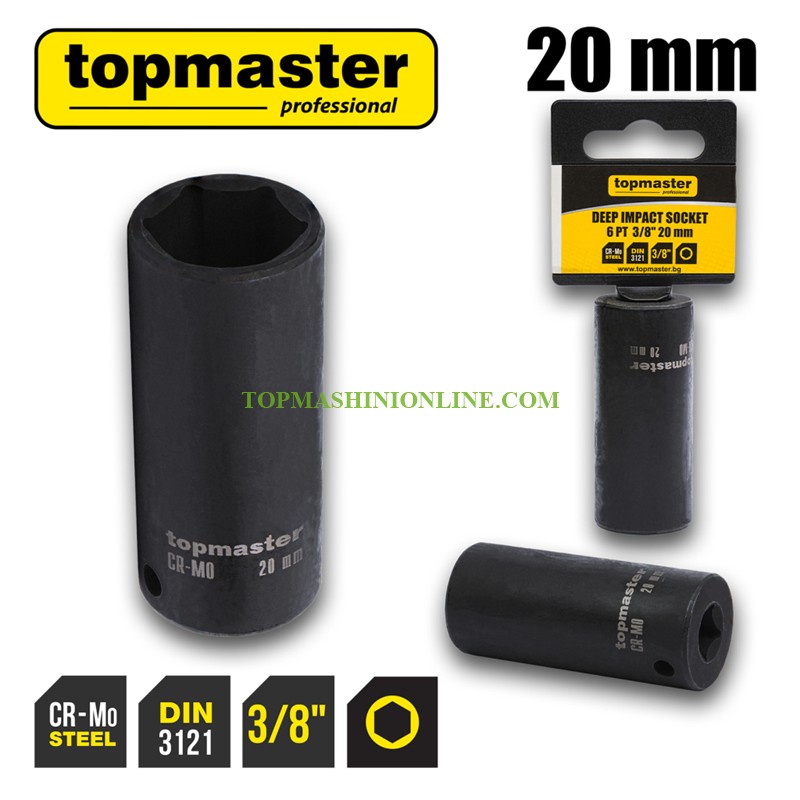 Шестостенна удължена ударна вложка 3/8", 20 мм Top Master Pro 330833 e изработена от висококачествена хром-молибденова стомана (Cr-Mo), с 6-стенна конструкция за сигурен захват и равномерно предаване на въртящия момент. Удълженият дизайн осигурява лесен достъп до дълбоко разположени болтове и гайки. Оборудвана с отвор за заключващ пин, който позволява сигурно фиксиране към ударния инструмент и предотвратява случайно освобождаване по време на работа. Вложката е закалена по стандарт DIN 3121 за висока издръжливост и дълъг експлоатационен живот.