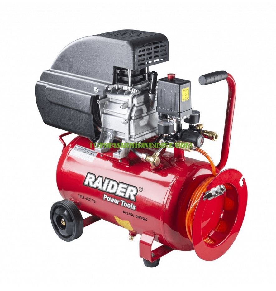 Компресор Raider RD-AC12 089407 с мощност 1.5 kW, обем 24 литра, налягане 8 bar и изходящ дебит 110 литра в минута е оборудван с два манометъра, като единият показва налягането след редуцир вентила, а другия налягането в резервоара, 5 метра маркуч, който има възможност за съхранение директно върху компресора и три бързи връзки - 1-вата е директно от изхода на резервоара, 2-рата е след редуцир вентила и 3-тата бърза връзка е на маркуча. Компресорът се доставя с масло в картера и спираловиден маркуч с бързи връзки.