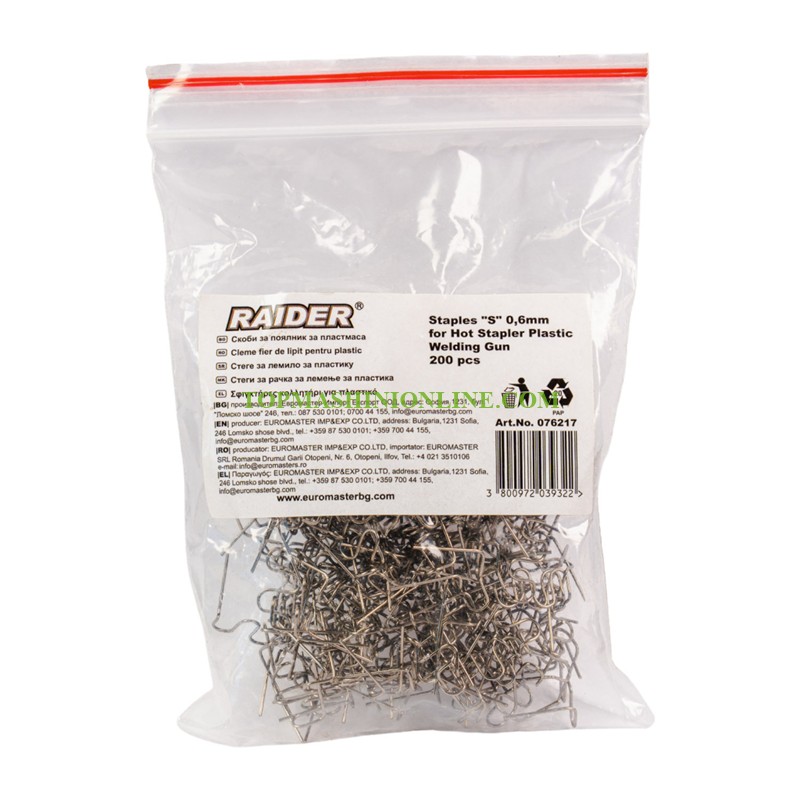 Скоби за поялник за пластмаса 200 броя Raider 076217 са специализирани консумативи, предназначени за ремонт и подсилване на пластмасови елементи, като като брони, панели, резервоари, пластмасови компоненти и други. Подходящи за работа с поялници за пластмаса, работещи на температури до 700°C.