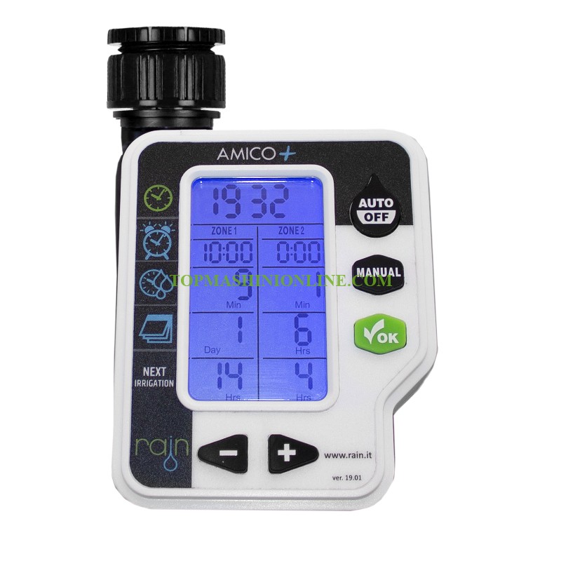 Електронен таймер-програматор за вода Rain Amico 2 + е създаден за бързо и ефикасно програмиране на контролера в „три прости стъпки“. Въведете времето за напояване, продължителността и честотата на напояване и програмирането на системата е завършено. Това е особено подходящо за напояване на малки тераси и балкони. 3-инчовият дисплей с подсветка ви показва пълния график за напояване с един поглед. Вече не е необходимо да навигирате през различни менюта за програмиране, за да видите графика за напояване. Сменяемият електронен блок позволява лесно програмиране, смяна на батерията и бърза поддръжка на електромагнитния вентил. Присъединяване - вход - 3/4'' и 1'' Ж, изход - 3/4'' М. Захранването се осъществява от две батерии 1.5 V AA (не са включени). Корпусът е с твърд пластмасов капак и сменяем контролен блок. Монтира се само вертикално. Налягане 1-6 bar. Максимален дебит 40 л/мин. Продължителност на поливането 1-240 минути.